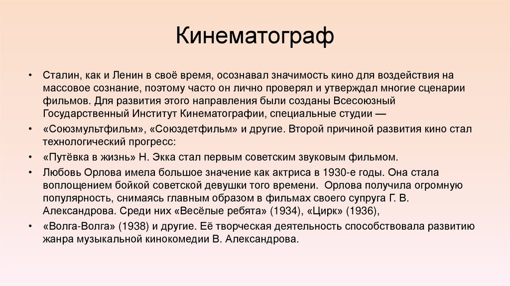 Кинематограф• Сталин, как и Ленин в своё время, осознавал значимость кино для воздействия на