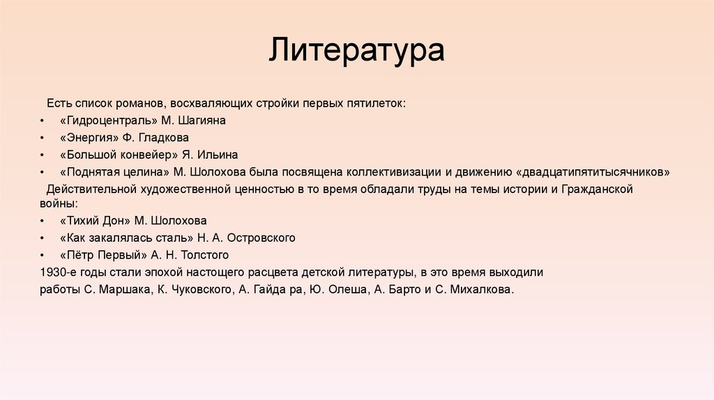 ЛитератураЕсть список романов, восхваляющих стройки первых пятилеток: