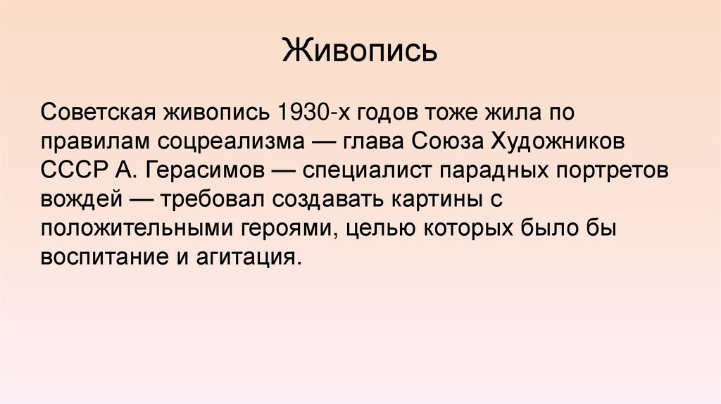 ЖивописьСоветская живопись 1930-х годов тоже жила по