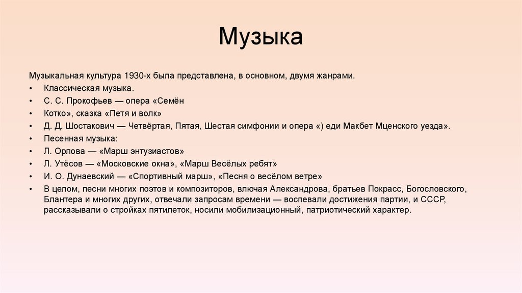 МузыкаМузыкальная культура 1930-х была представлена, в основном, двумя жанрами.