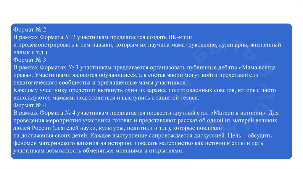 В рамках Форматах № 3 участникам предлагается организовать публичные дебаты «Мама всегда