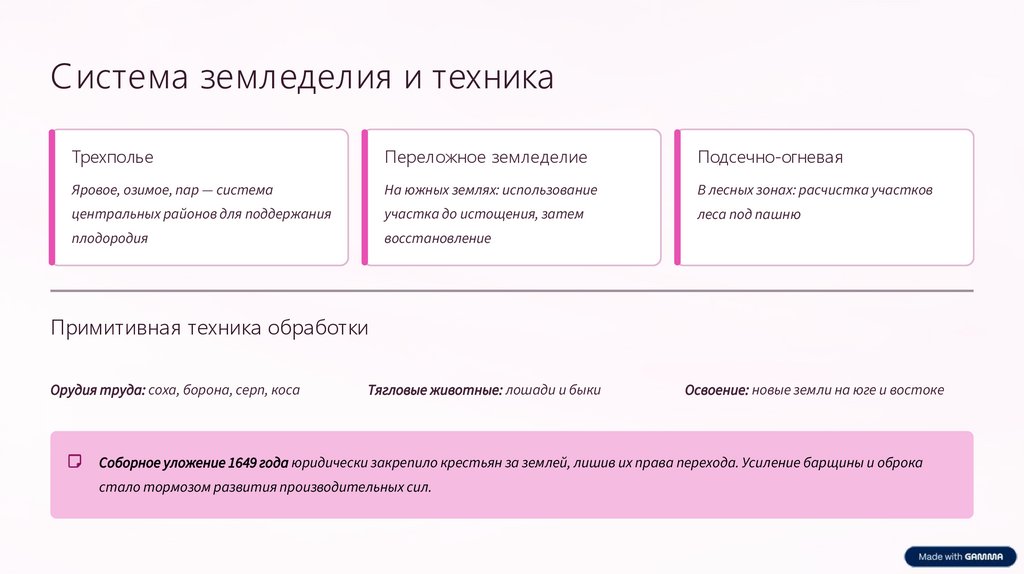 Соборное уложение 1649 года юридически закрепило крестьян за землей, лишив их права перехода. Усиление барщины и оброка
