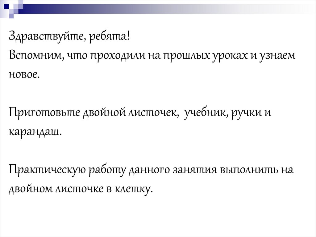 1. Здравствуйте, ребята! Вспомним, что проходили на прошлых уроках и узнаем новое. Приготовьте двойной листочек, учебник, ручки и