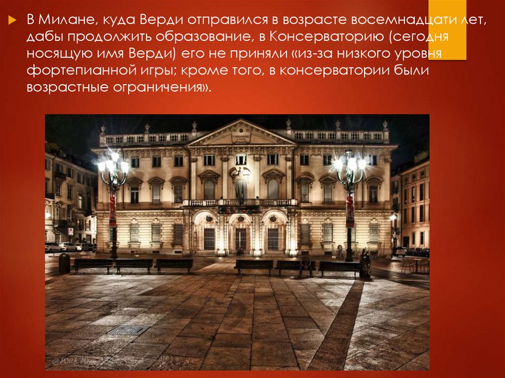В Милане, куда Верди отправился в возрасте восемнадцати лет,дабы продолжить образование, в Консерваторию (сегодня