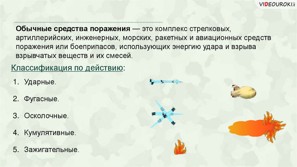 Обычные средства поражения — это комплекс стрелковых,артиллерийских, инженерных, морских, ракетных и авиационных средств