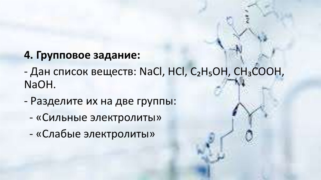 4. Групповое задание:- Дан список веществ: NaCl, HCl, C₂H₅OH, CH₃COOH,