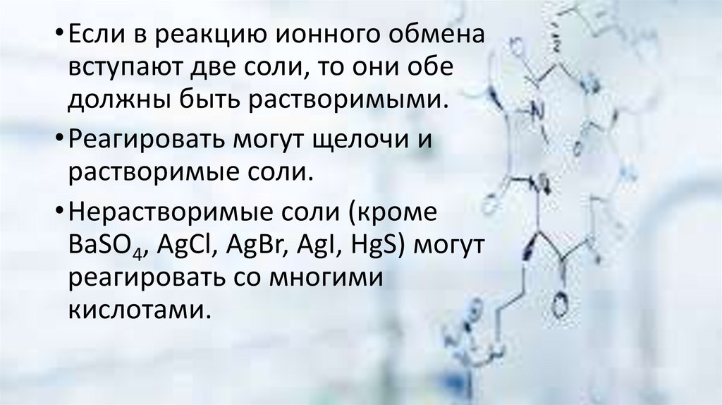 • Если в реакцию ионного обменавступают две соли, то они обе