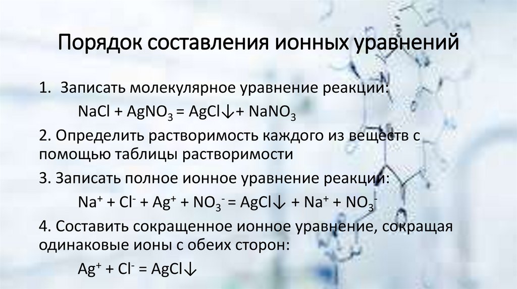 Порядок составления ионных уравнений1. Записать молекулярное уравнение реакции: