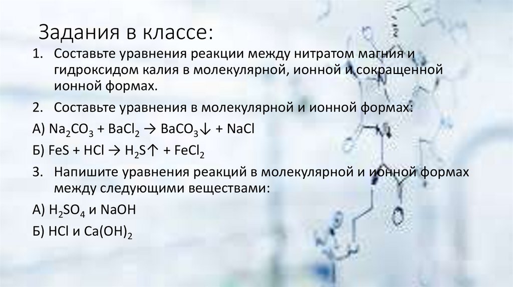 Задания в классе:1. Составьте уравнения реакции между нитратом магния и