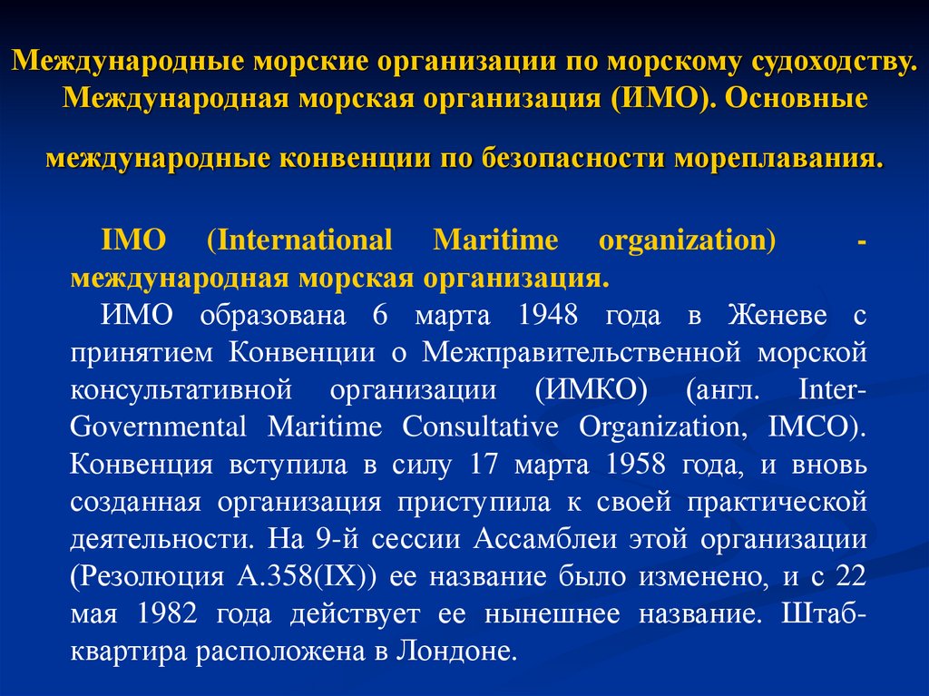 1. Международные морские организации по морскому судоходству. Международная морская организация (ИМО). Основные международные