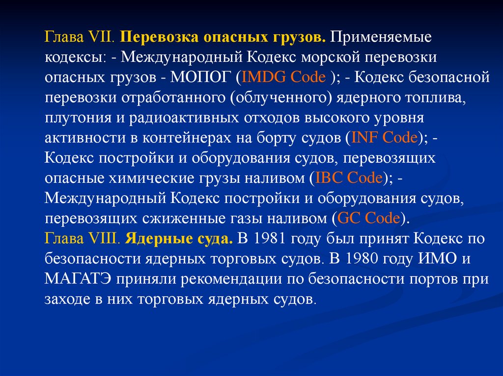 Глава VII. Перевозка опасных грузов. Применяемыекодексы: - Международный Кодекс морской перевозки