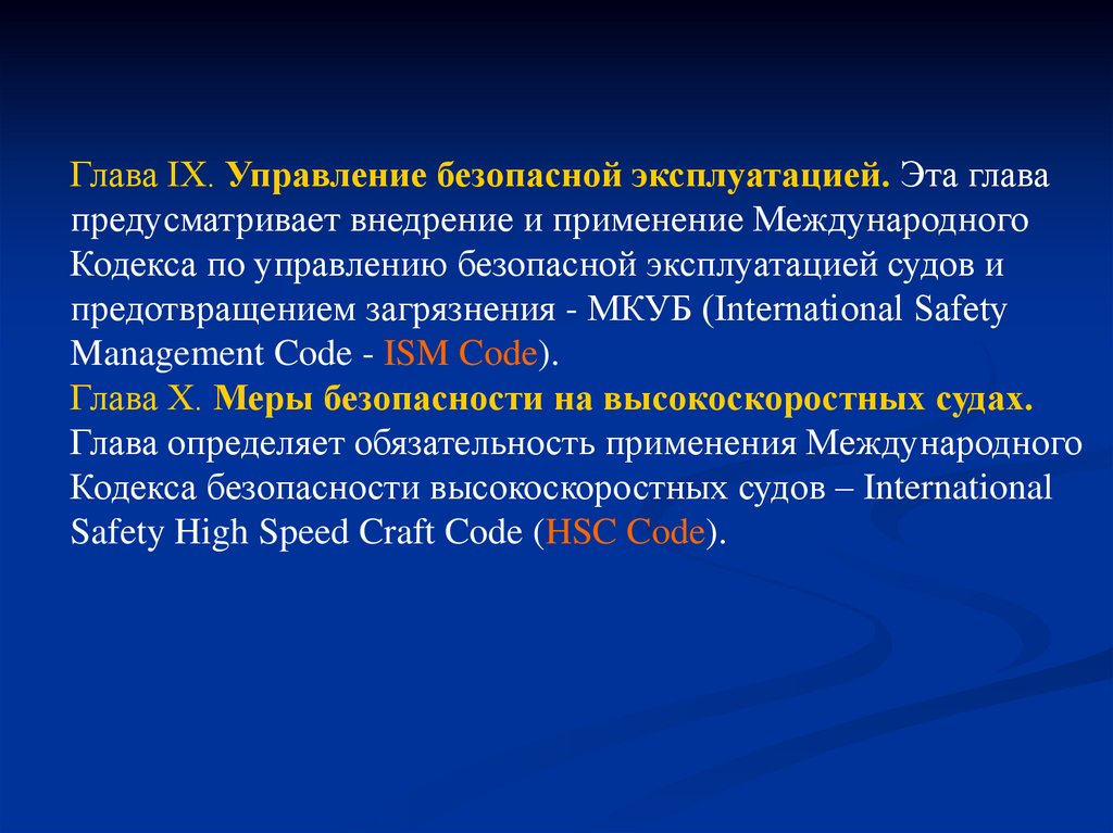 Глава IX. Управление безопасной эксплуатацией. Эта главапредусматривает внедрение и применение Международного