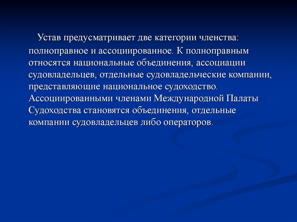 Устав предусматривает две категории членства:полноправное и ассоциированное. К полноправным