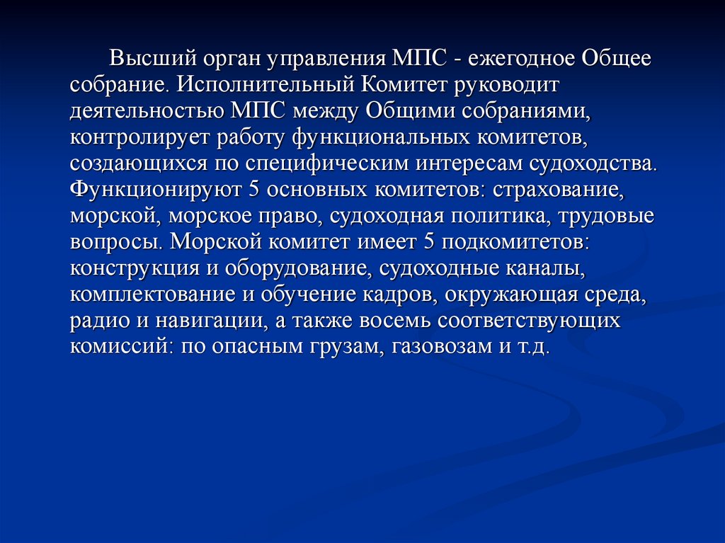 Высший орган управления МПС - ежегодное Общеесобрание. Исполнительный Комитет руководит