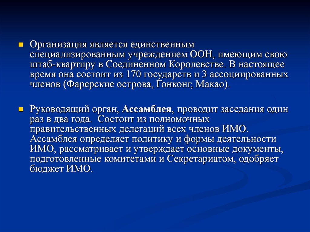 Организация является единственнымспециализированным учреждением ООН, имеющим свою