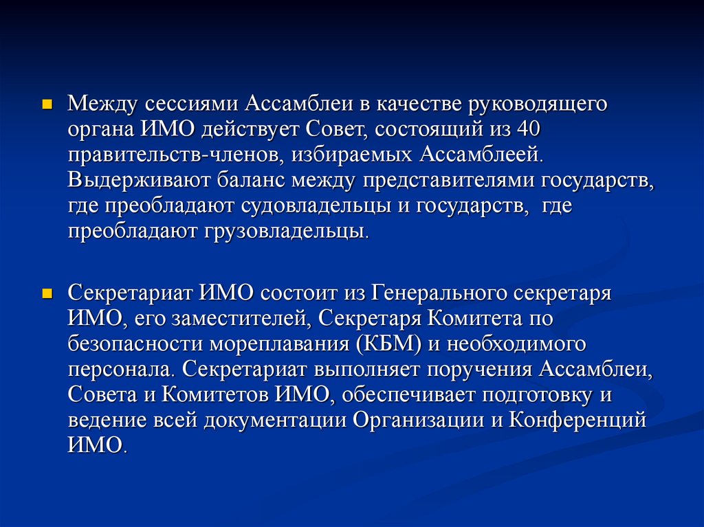 Между сессиями Ассамблеи в качестве руководящегооргана ИМО действует Совет, состоящий из 40