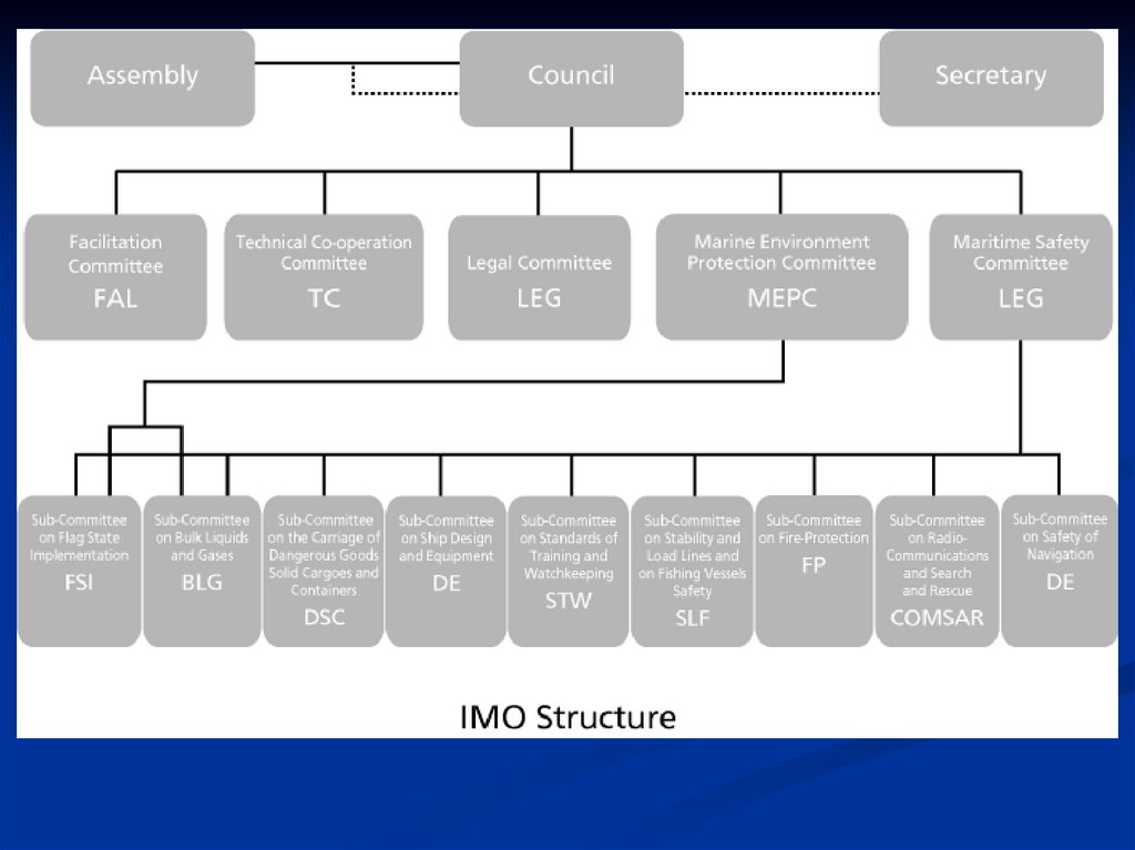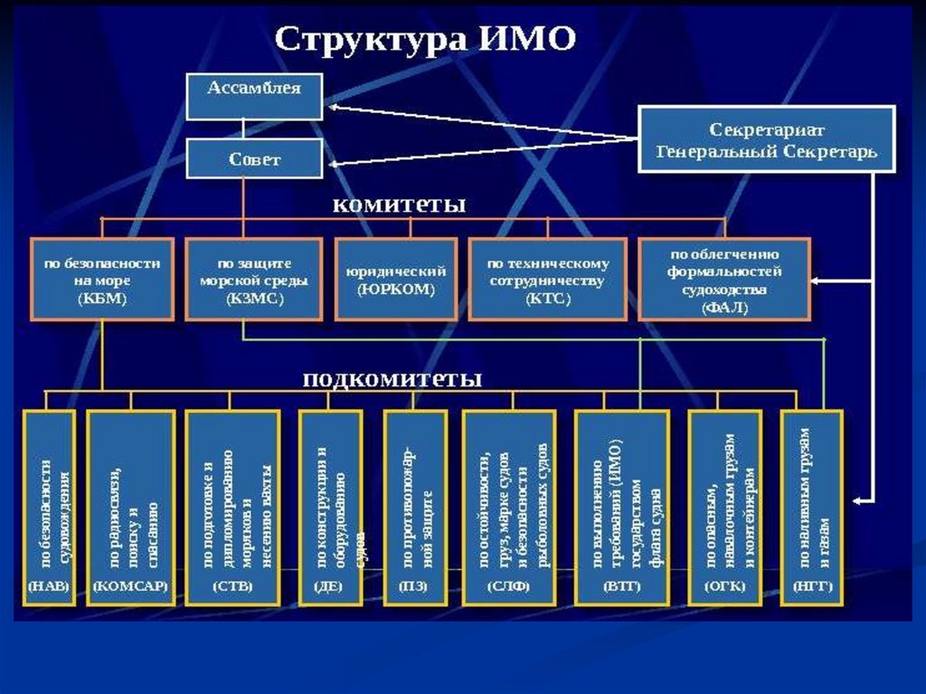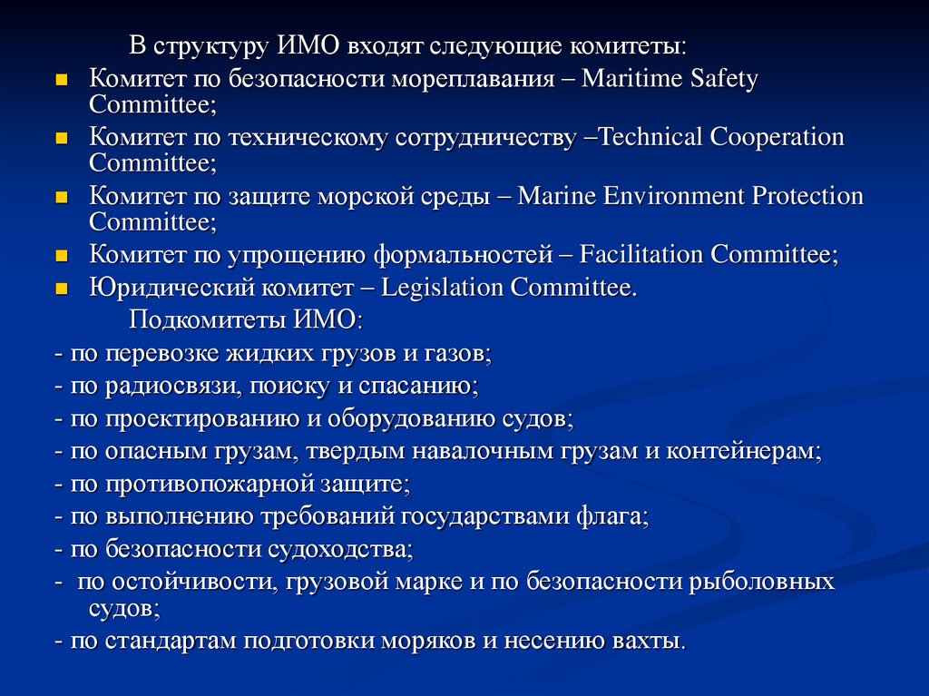 В структуру ИМО входят следующие комитеты:Комитет по безопасности мореплавания – Maritime Safety