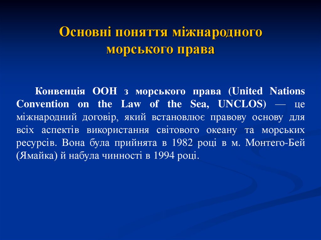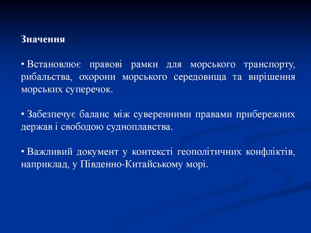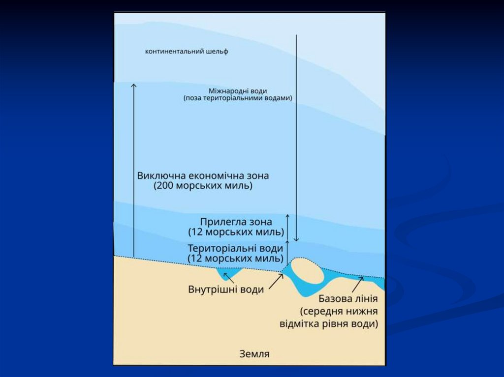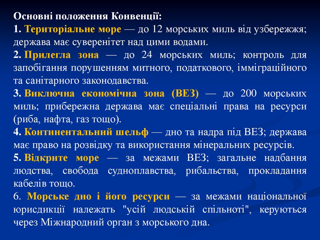 Основні положення Конвенції:1. Територіальне море — до 12 морських миль від узбережжя;