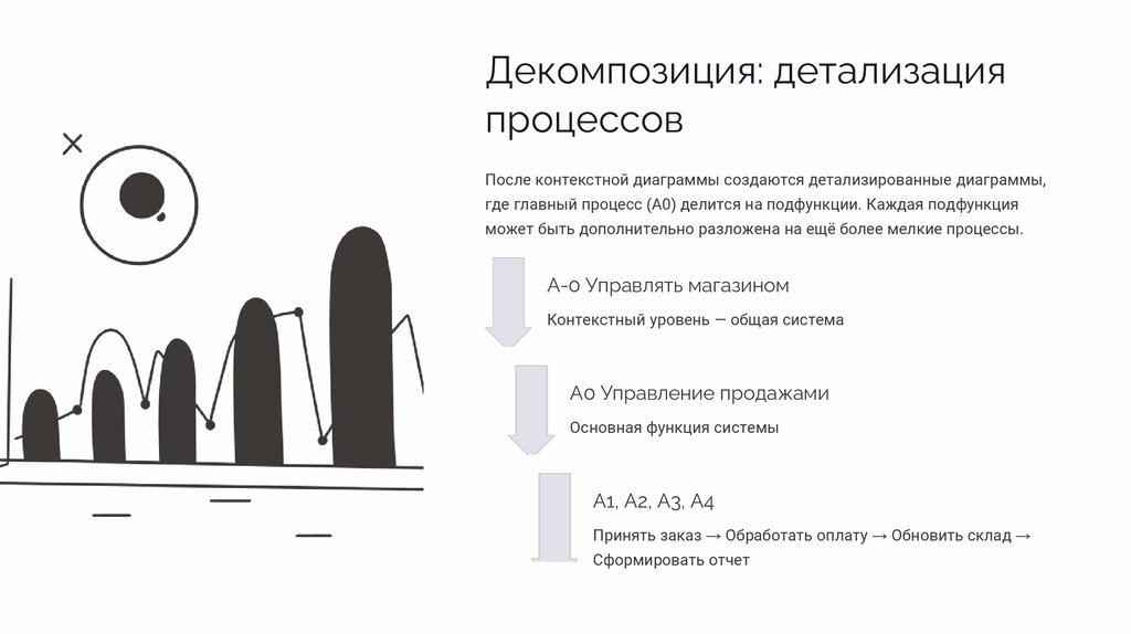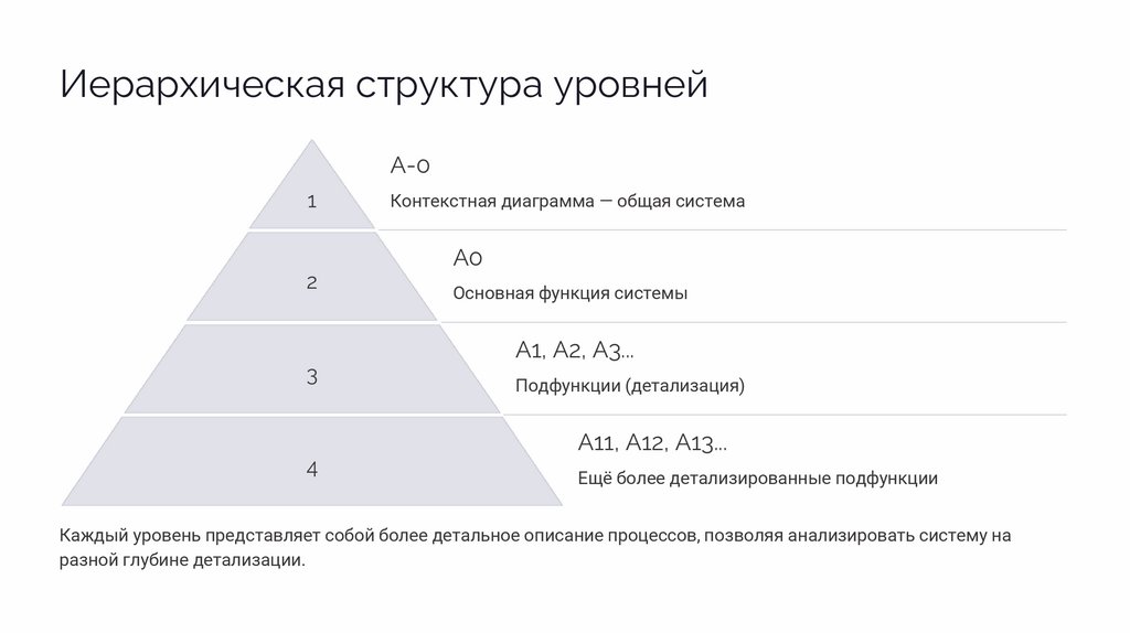 Каждый уровень представляет собой более детальное описание процессов, позволяя анализировать систему на