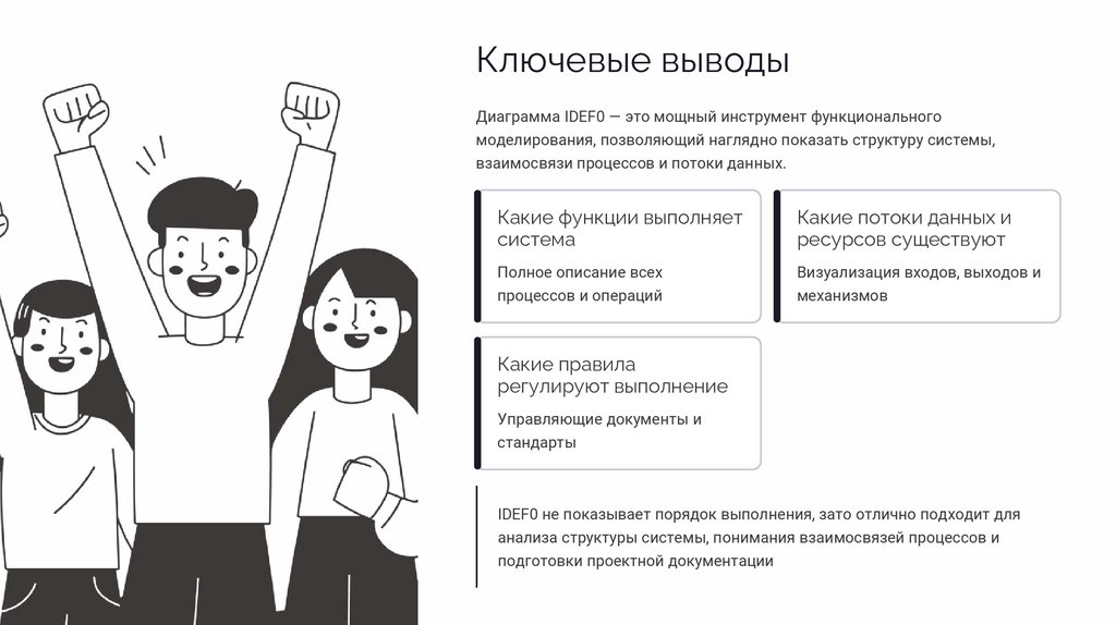 Ключевые выводыДиаграмма IDEF0 — это мощный инструмент функционального