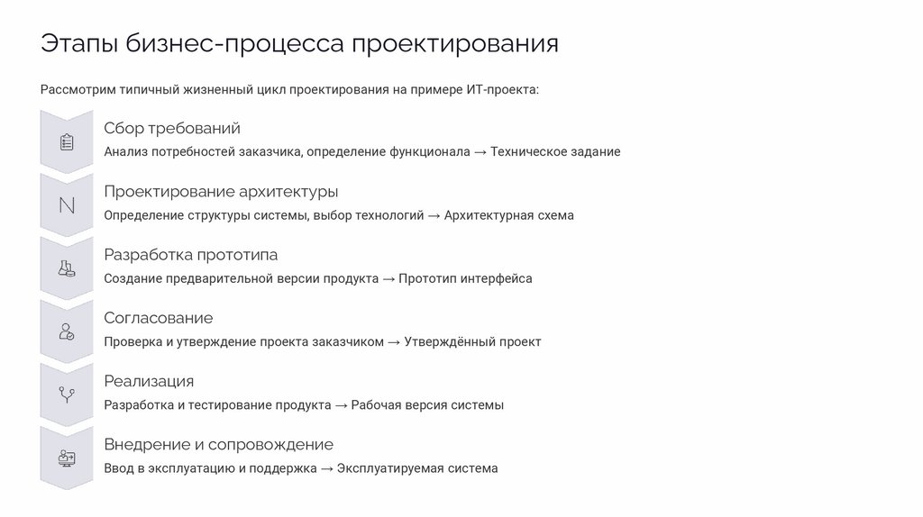 Этапы бизнес-процесса проектированияРассмотрим типичный жизненный цикл проектирования на примере ИТ-проекта: