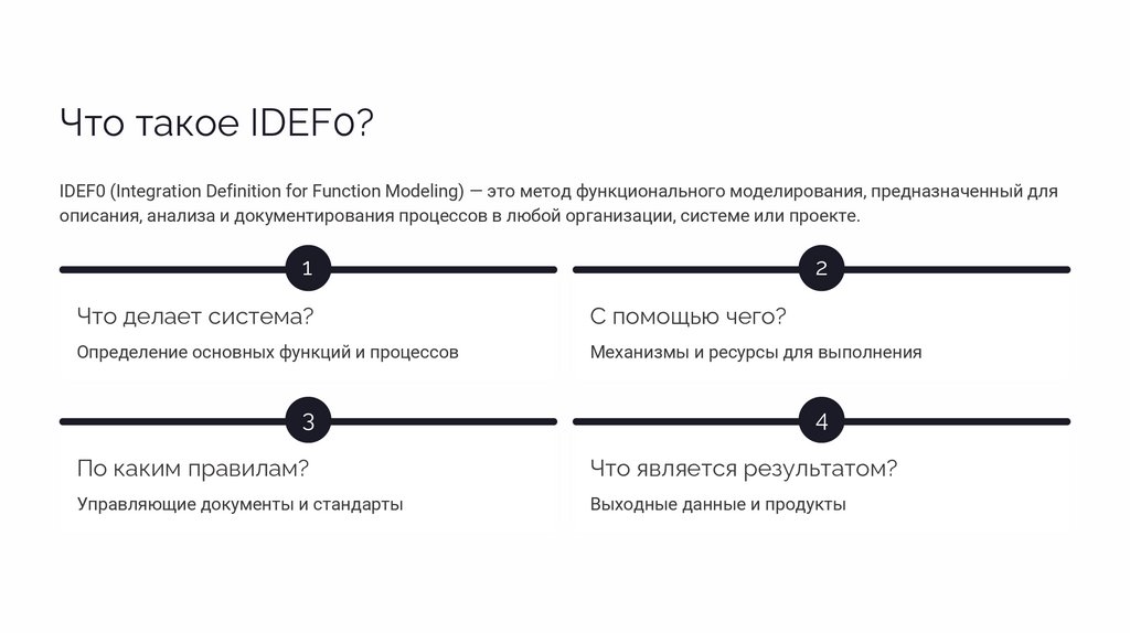 Что такое IDEF0?IDEF0 (Integration Definition for Function Modeling) — это метод функционального моделирования, предназначенный для