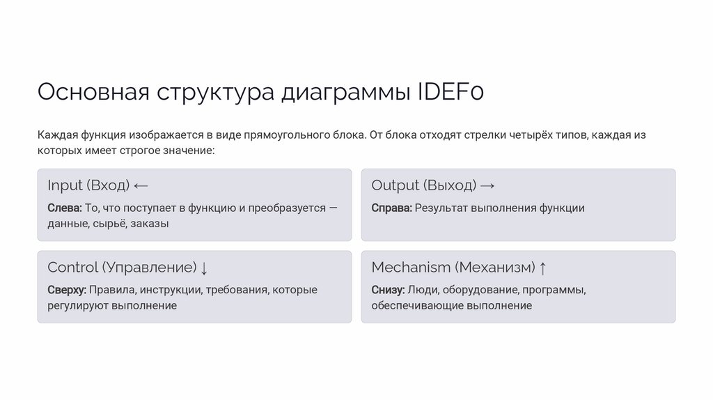 Основная структура диаграммы IDEF0Каждая функция изображается в виде прямоугольного блока. От блока отходят стрелки четырёх типов, каждая из