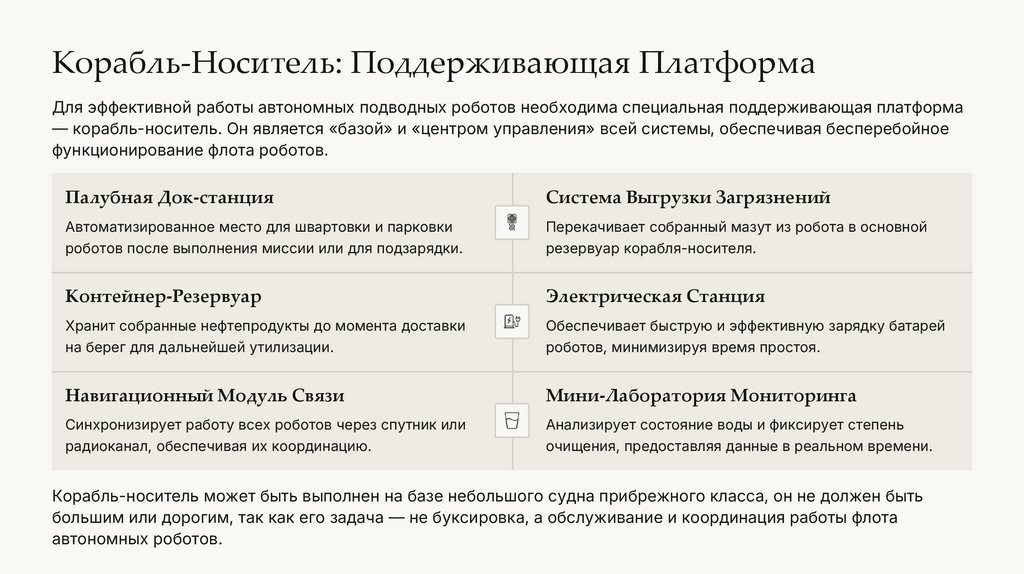Корабль-Носитель: Поддерживающая ПлатформаДля эффективной работы автономных подводных роботов необходима специальная поддерживающая платформа