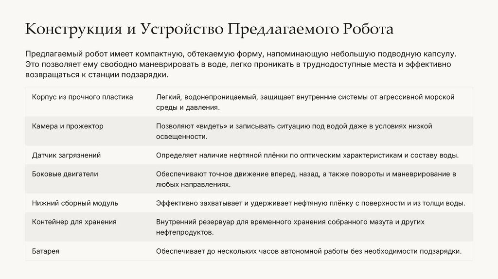 Конструкция и Устройство Предлагаемого РоботаПредлагаемый робот имеет компактную, обтекаемую форму, напоминающую небольшую подводную капсулу.