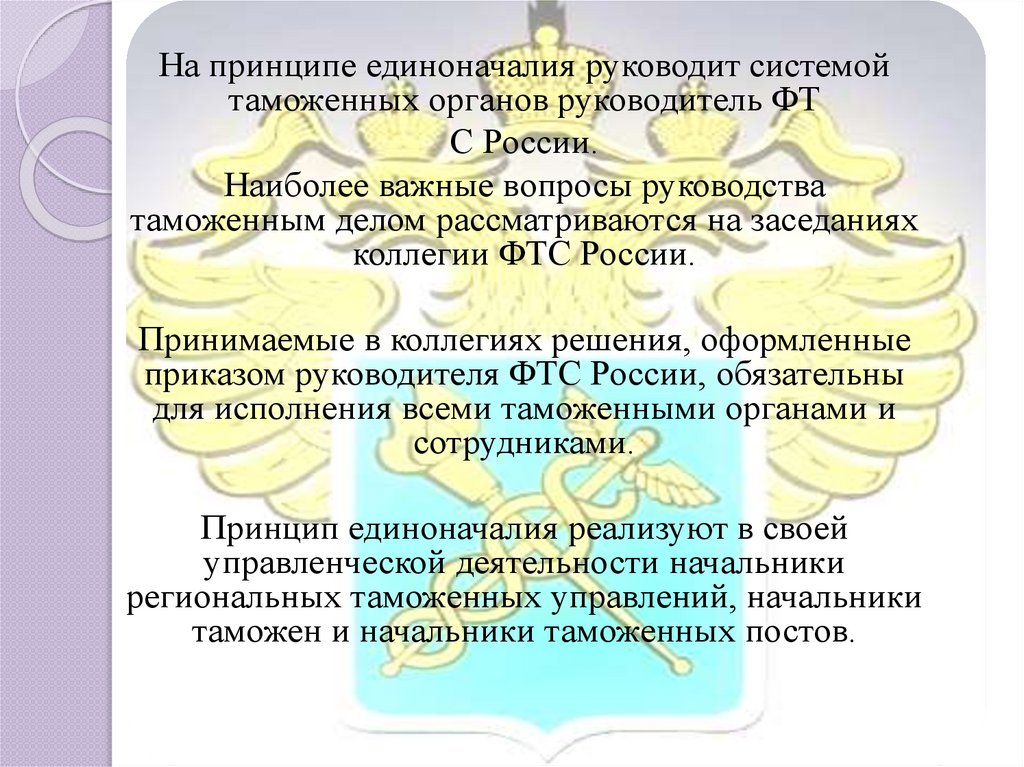 На принципе единоначалия руководит системойтаможенных органов руководитель ФТ
