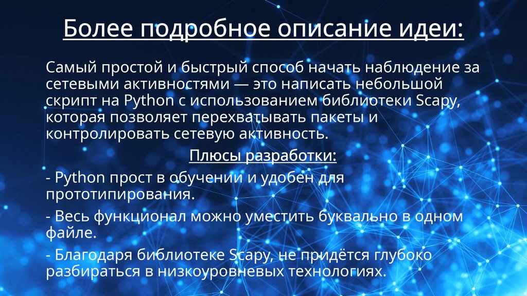 - Благодаря библиотеке Scapy, не придётся глубоко
