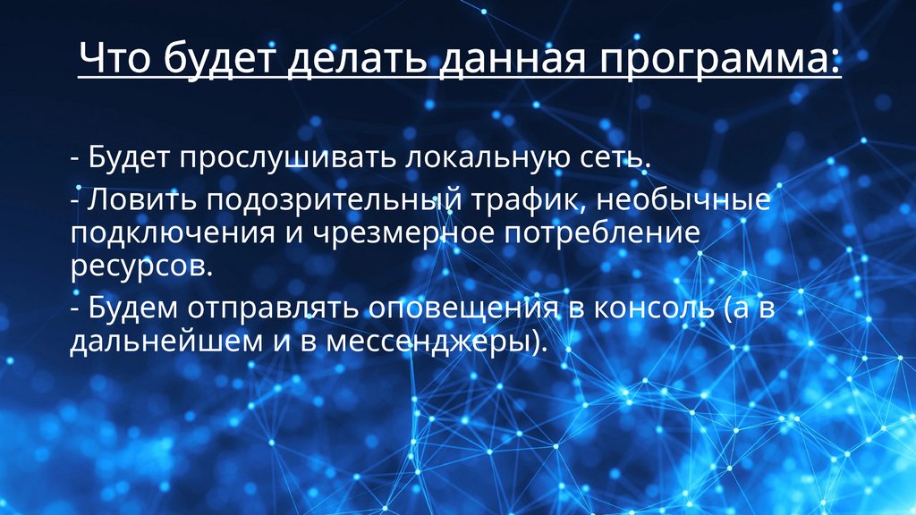 Что будет делать данная программа:- Будет прослушивать локальную сеть.