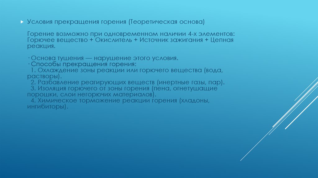Условия прекращения горения (Теоретическая основа)Горение возможно при одновременном наличии 4-х элементов: