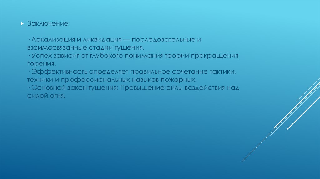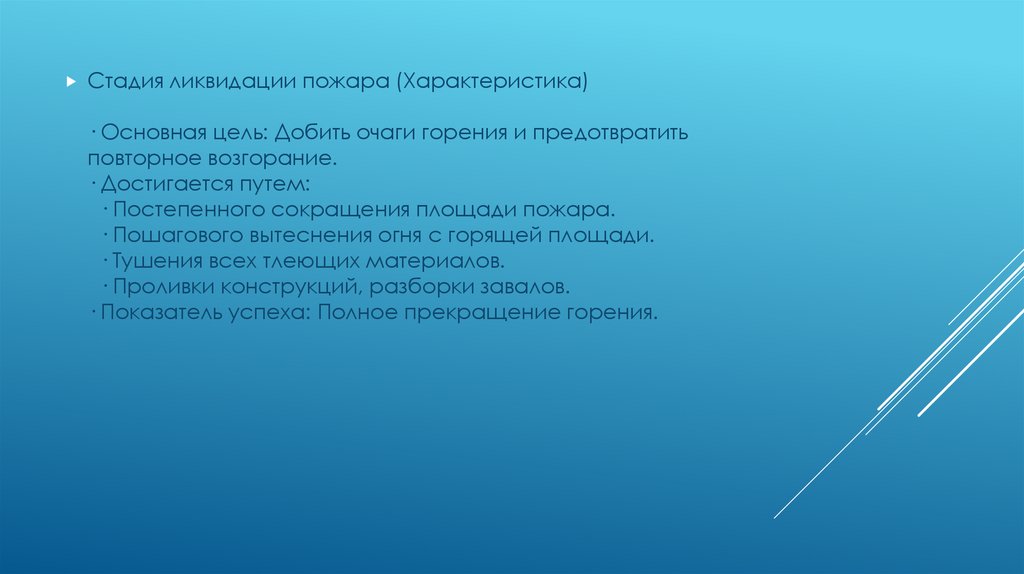 Стадия ликвидации пожара (Характеристика)· Основная цель: Добить очаги горения и предотвратить