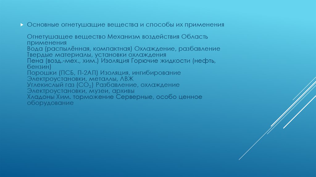 Основные огнетушащие вещества и способы их примененияОгнетушащее вещество Механизм воздействия Область