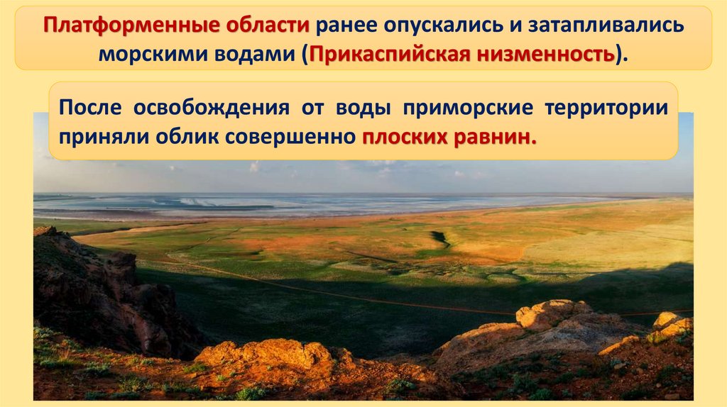 Платформенные области ранее опускались и затапливалисьморскими водами (Прикаспийская низменность).