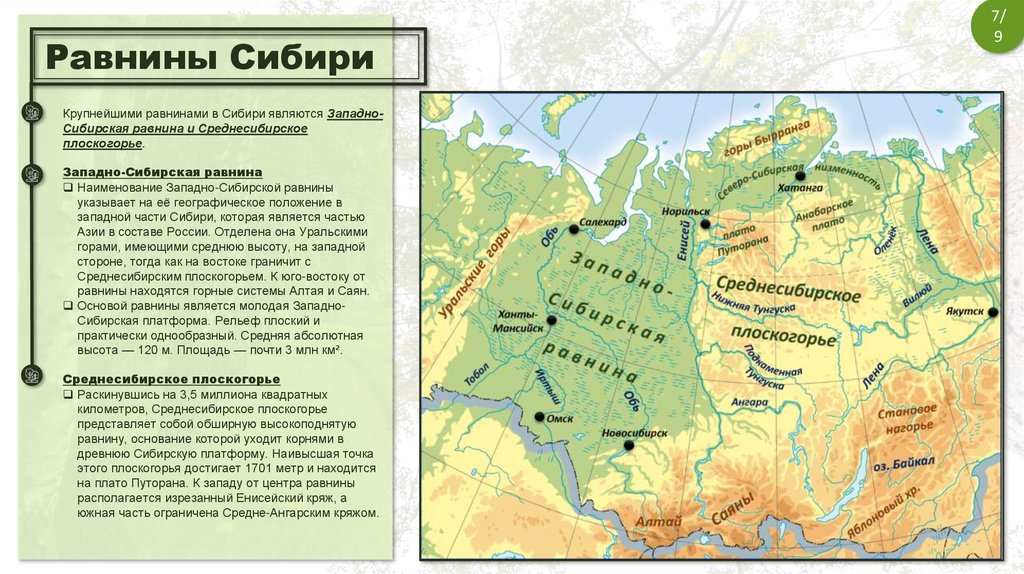 Равнины СибириКрупнейшими равнинами в Сибири являются ЗападноСибирская равнина и Среднесибирское