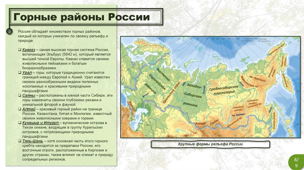 1. Россия имеет разнообразные формы рельефа, включая горы, равнины,