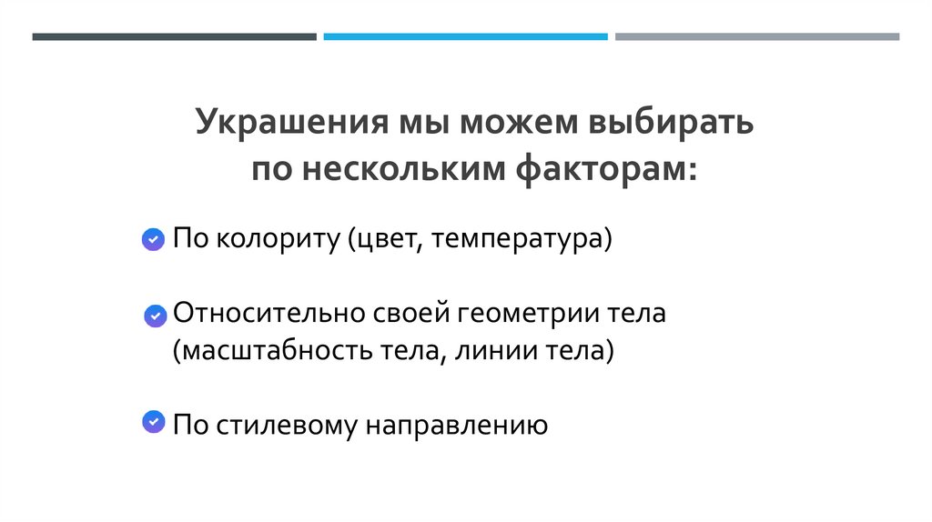 Украшения мы можем выбиратьпо нескольким факторам: