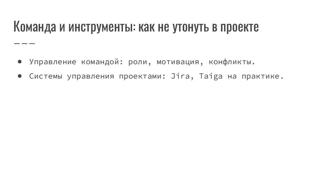 Команда и инструменты: как не утонуть в проекте● Управление командой: роли, мотивация, конфликты.