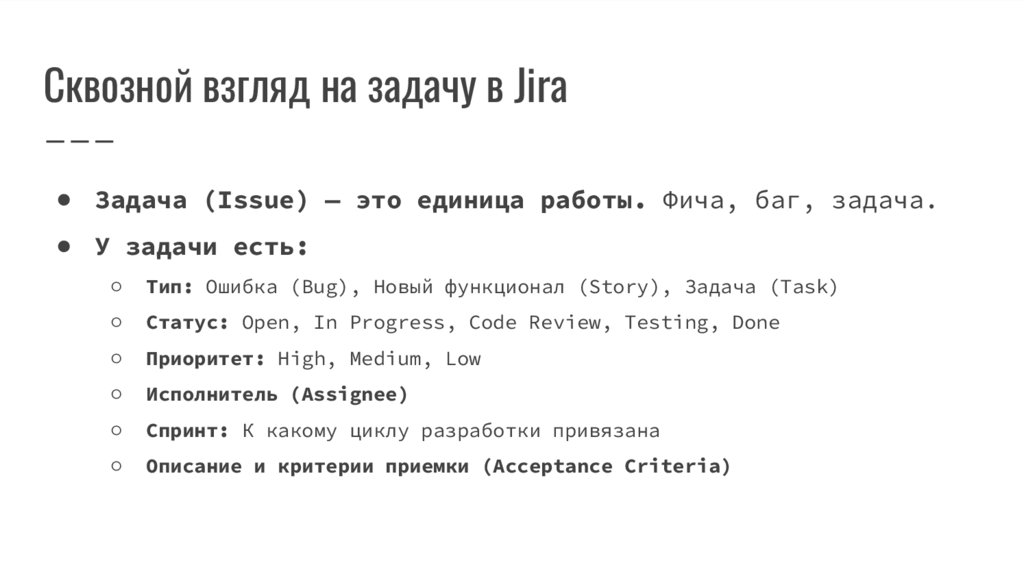 Сквозной взгляд на задачу в Jira● Задача (Issue) — это единица работы. Фича, баг, задача.