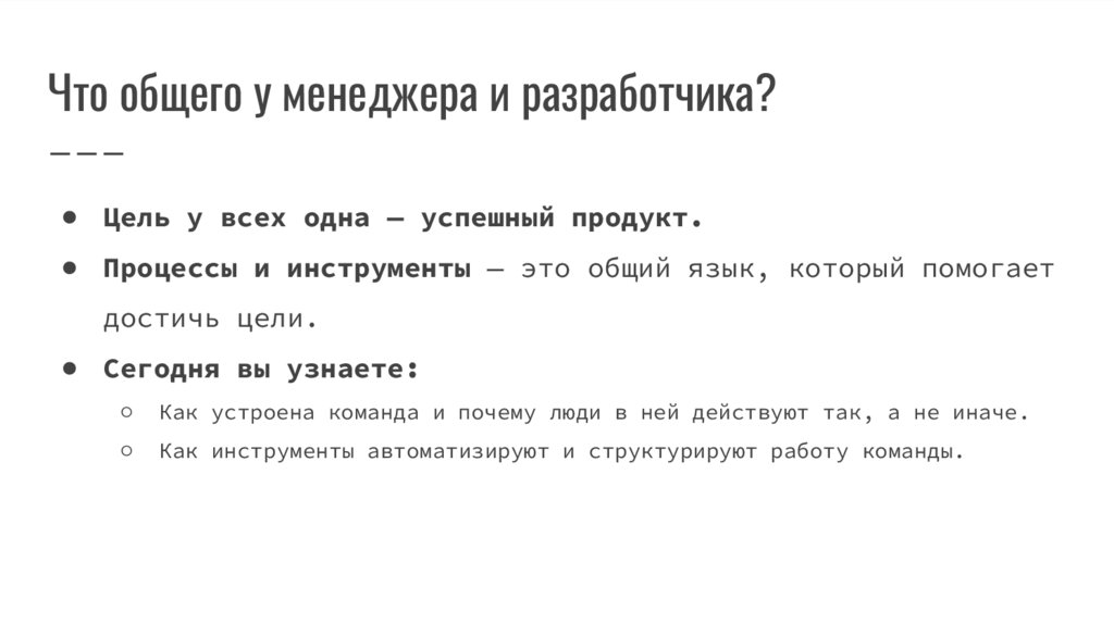 Что общего у менеджера и разработчика?● Цель у всех одна — успешный продукт.