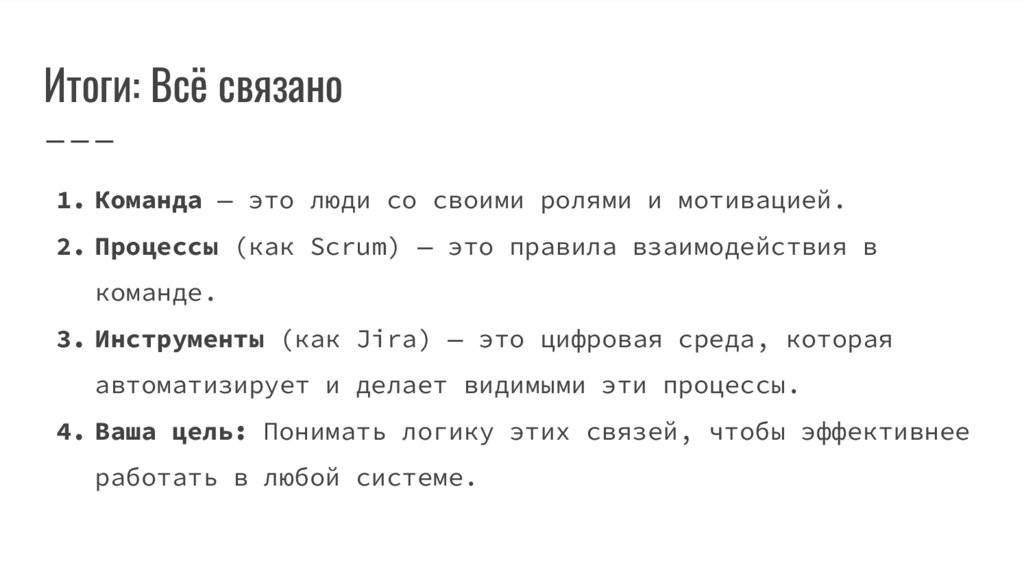 Итоги: Всё связано1. Команда — это люди со своими ролями и мотивацией.