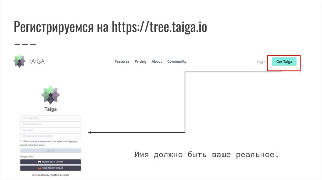 Регистрируемся на https://tree.taiga.ioИмя должно быть ваше реальное!