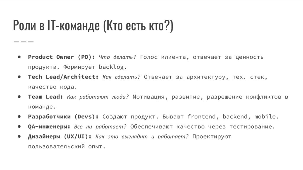 Роли в IT-команде (Кто есть кто?)Product Owner (PO): Что делать? Голос клиента, отвечает за ценность