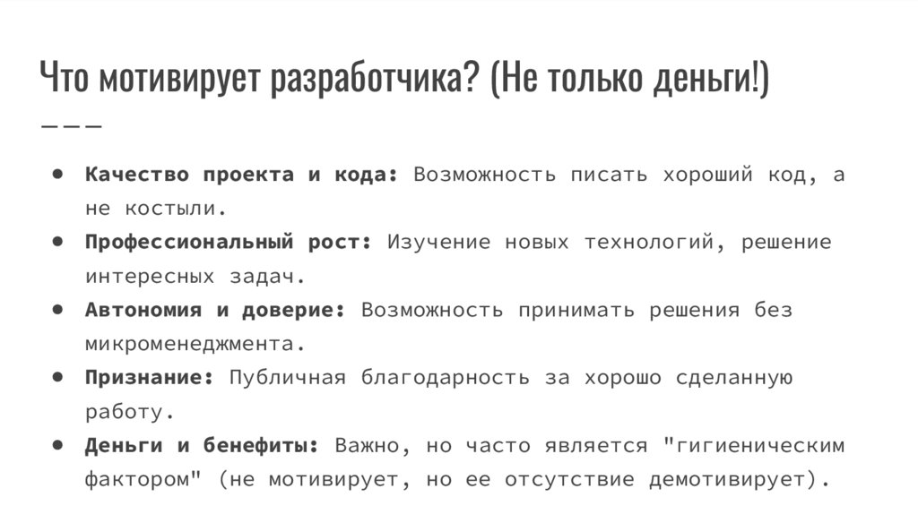 Что мотивирует разработчика? (Не только деньги!)● Качество проекта и кода: Возможность писать хороший код, а