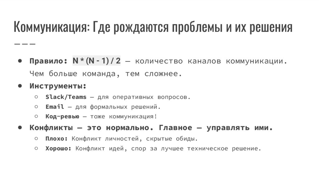 Коммуникация: Где рождаются проблемы и их решения● Правило: N * (N - 1) / 2 — количество каналов коммуникации.