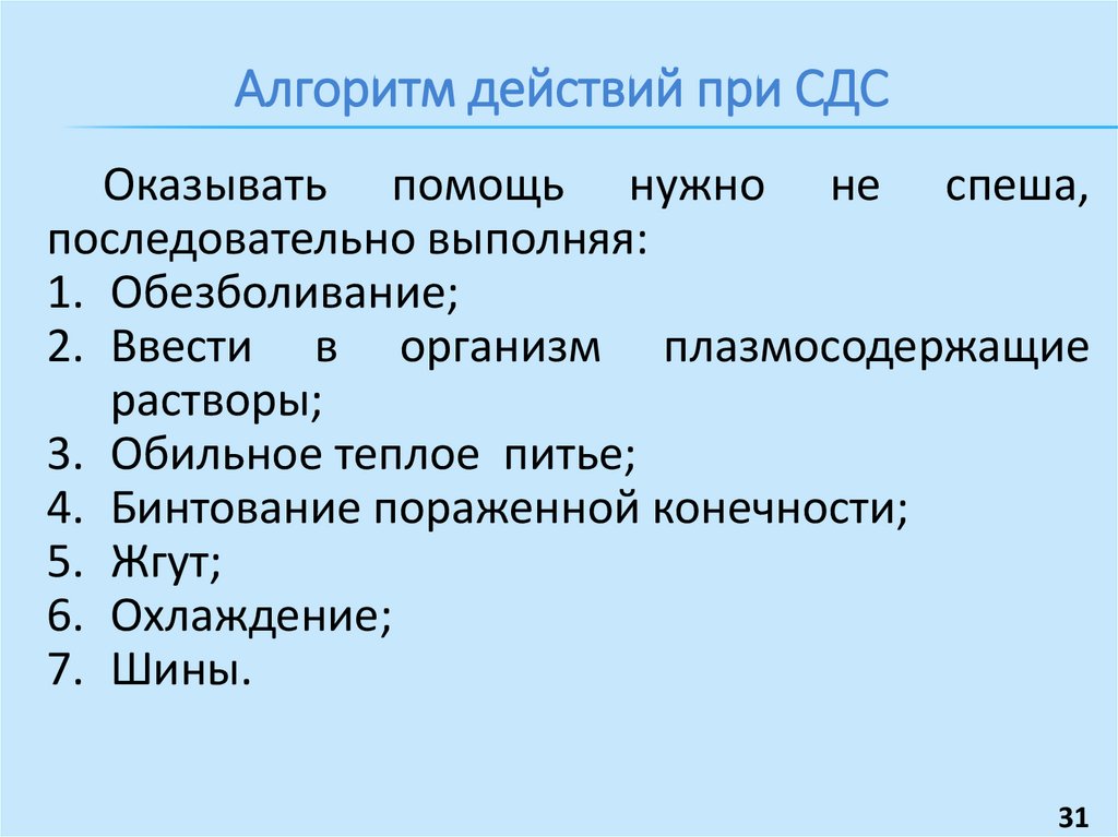 Алгоритм действий при СДСОказывать помощь нужно не спеша,