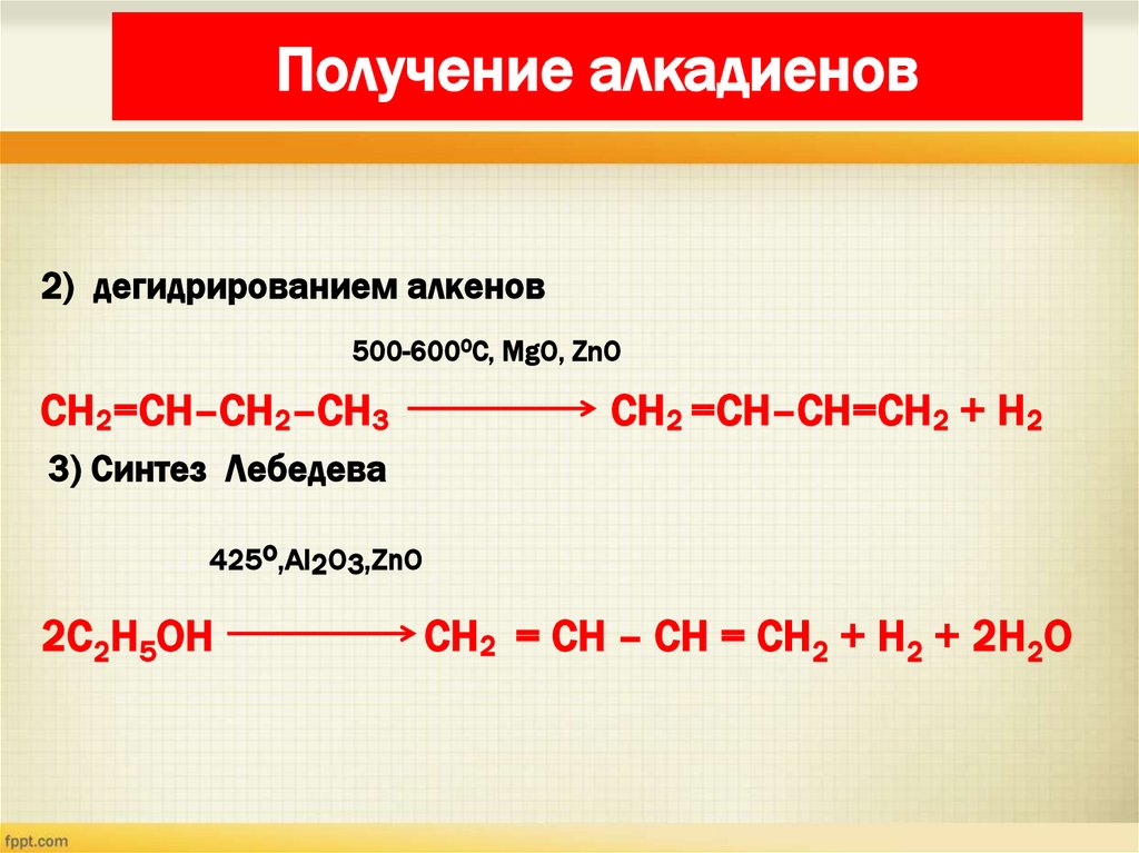1. Каталитическое дегидрирование алканов (через стадию образованияалкенов). Этим путем получают в промышленности дивинил из бутана,