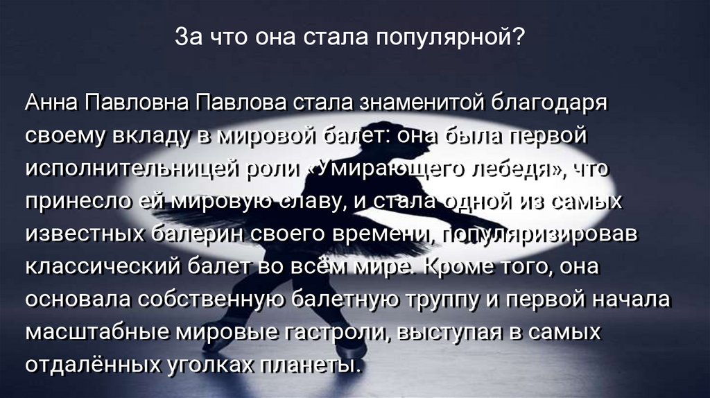 За что она стала популярной?Анна Павловна Павлова стала знаменитой благодаря